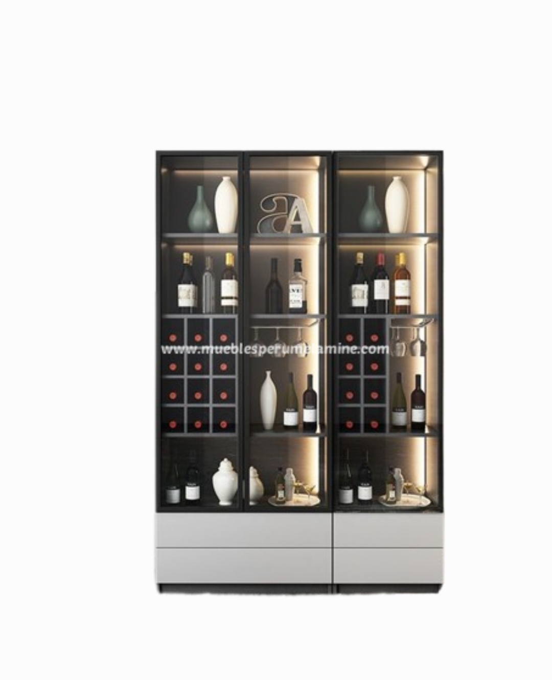 Mueble para sala fabricado en melamine de 18 mm con puertas de aluminio y vidrio bronce y luz led